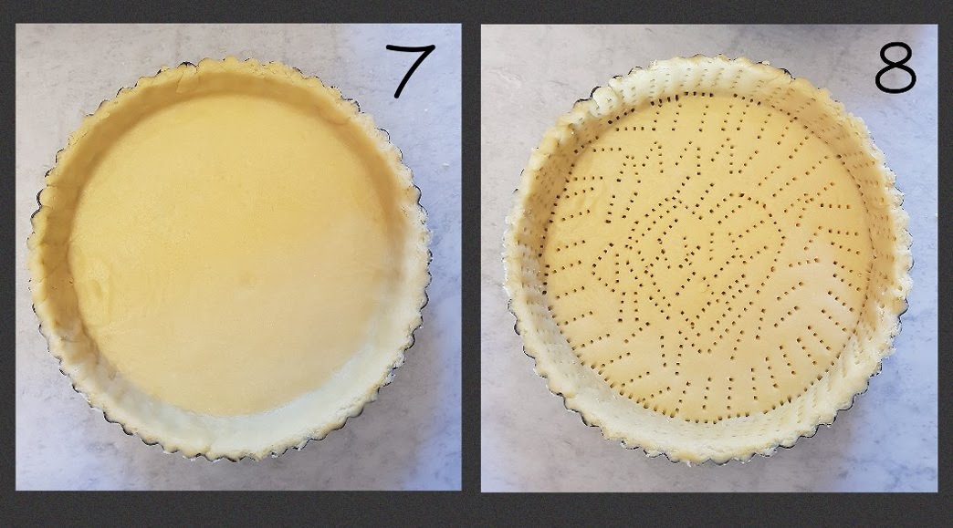 Fate ben aderire la pasta alla tortiera, eliminate con un coltello il bordo in eccesso [fig.7] e praticate dei fori sulla sua superficie con i rebbi di una forchetta [fig.8].